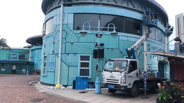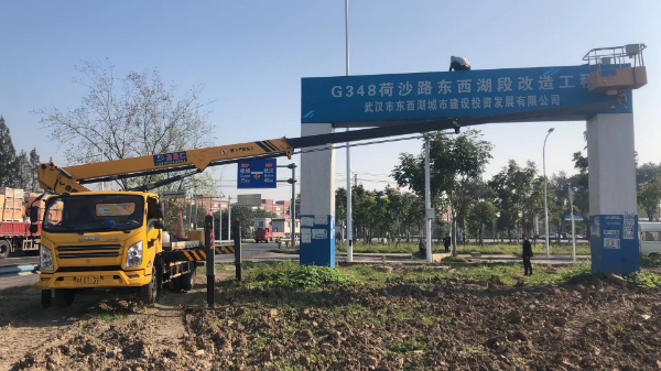 高空作業(yè)車載人安裝廣告標(biāo)識(shí)施工現(xiàn)…